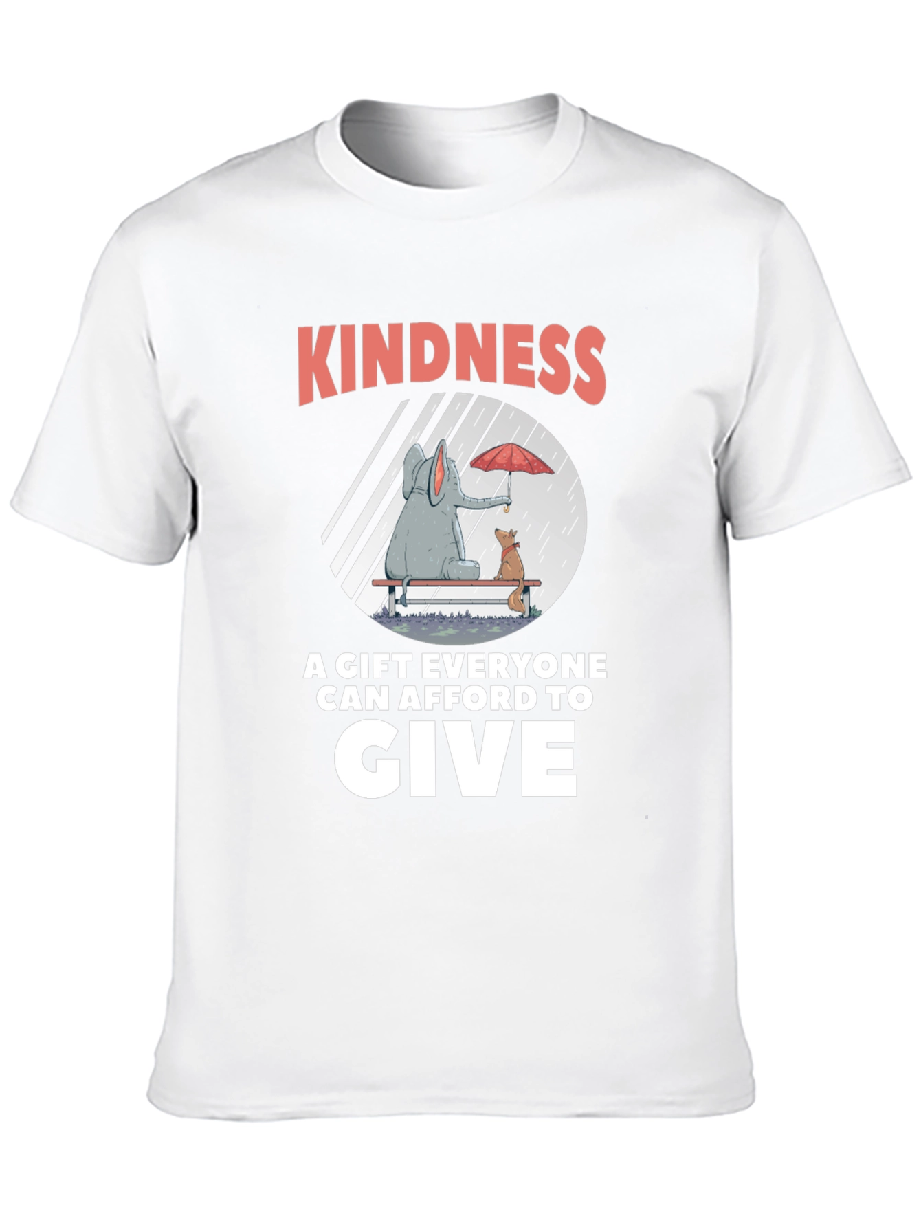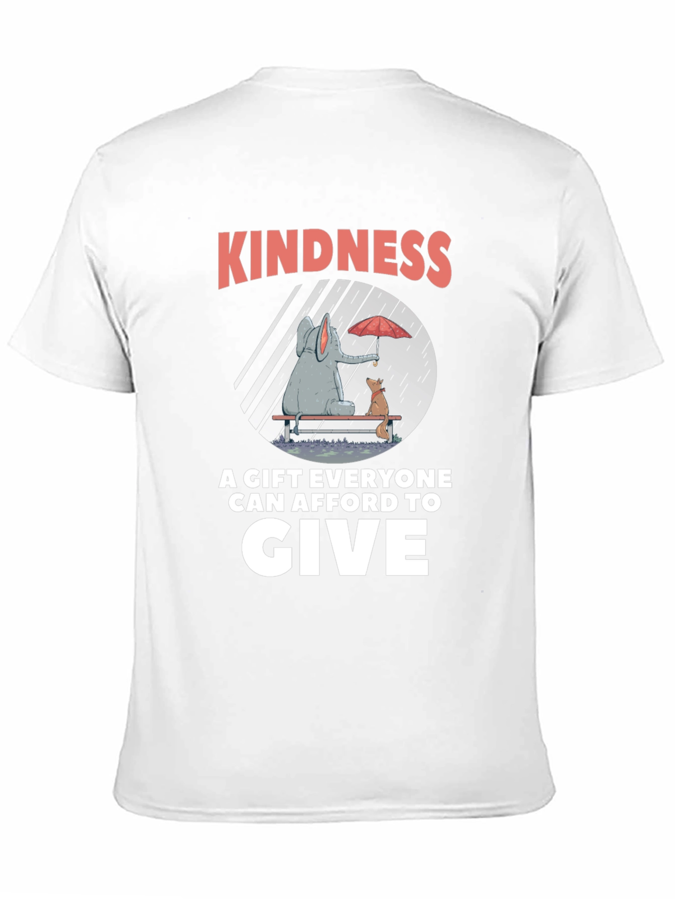 Luce esta camiseta negra con un diseño inspirador. En el centro, destaca la palabra "KINDNESS" (Bondad) en letras color salmón, sobre una imagen conmovedora de un elefante y un perro sentados juntos en un banco bajo la lluvia, con el elefante sosteniendo un paraguas rojo. Debajo, se lee "A GIFT EVERYONE CAN AFFORD TO GIVE" (Un regalo que todos pueden permitirse dar) en letras blancas. Esta camiseta no solo te vestirá con estilo, sino que también transmitirá un mensaje positivo y reflexivo. Perfecta para uso diario, eventos casuales o como un regalo significativo para alguien especial. Su diseño unisex y su corte cómodo la hacen ideal para cualquier persona que busque expresar sus valores a través de la moda.