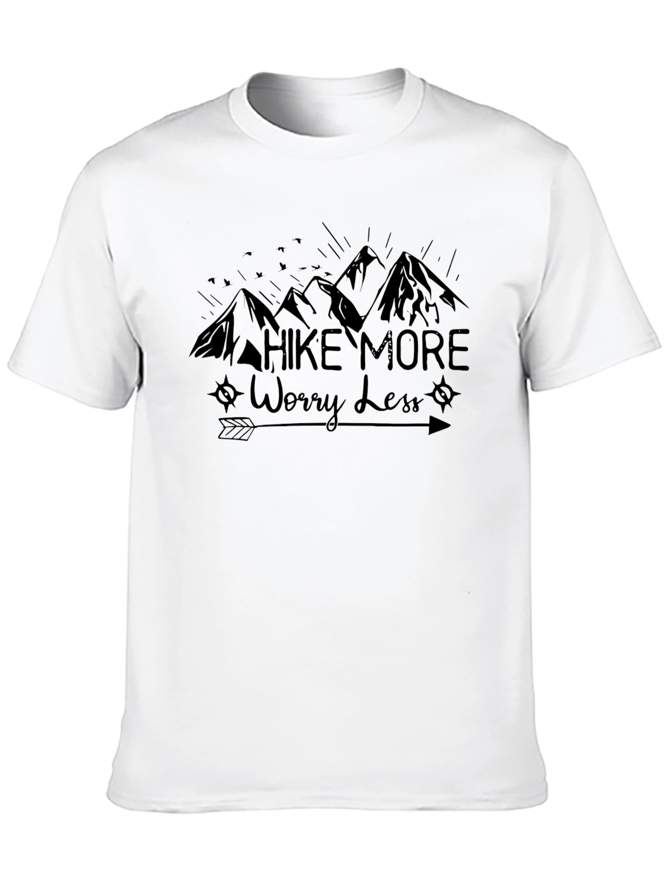 Aventura y estilo se unen en esta camiseta negra de manga corta. Su diseño presenta un inspirador lema "Hike More Worry Less" (Camina Más, Preocúpate Menos) acompañado de un gráfico de montañas y una flecha, evocando la naturaleza y el espíritu libre. Ideal para amantes del senderismo y actividades al aire libre que buscan una prenda cómoda y con mensaje. Su color negro la hace versátil para combinar con cualquier atuendo casual. Perfecta para llevar en tus excursiones, paseos por la ciudad o simplemente para expresar tu pasión por la aventura en tu día a día. ¡Inspírate y vive al máximo!