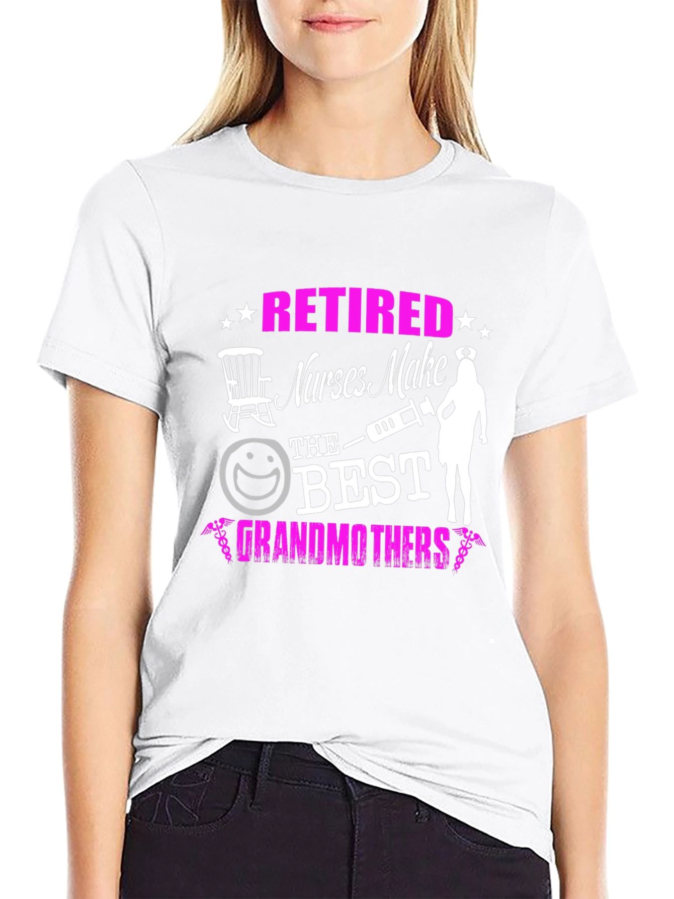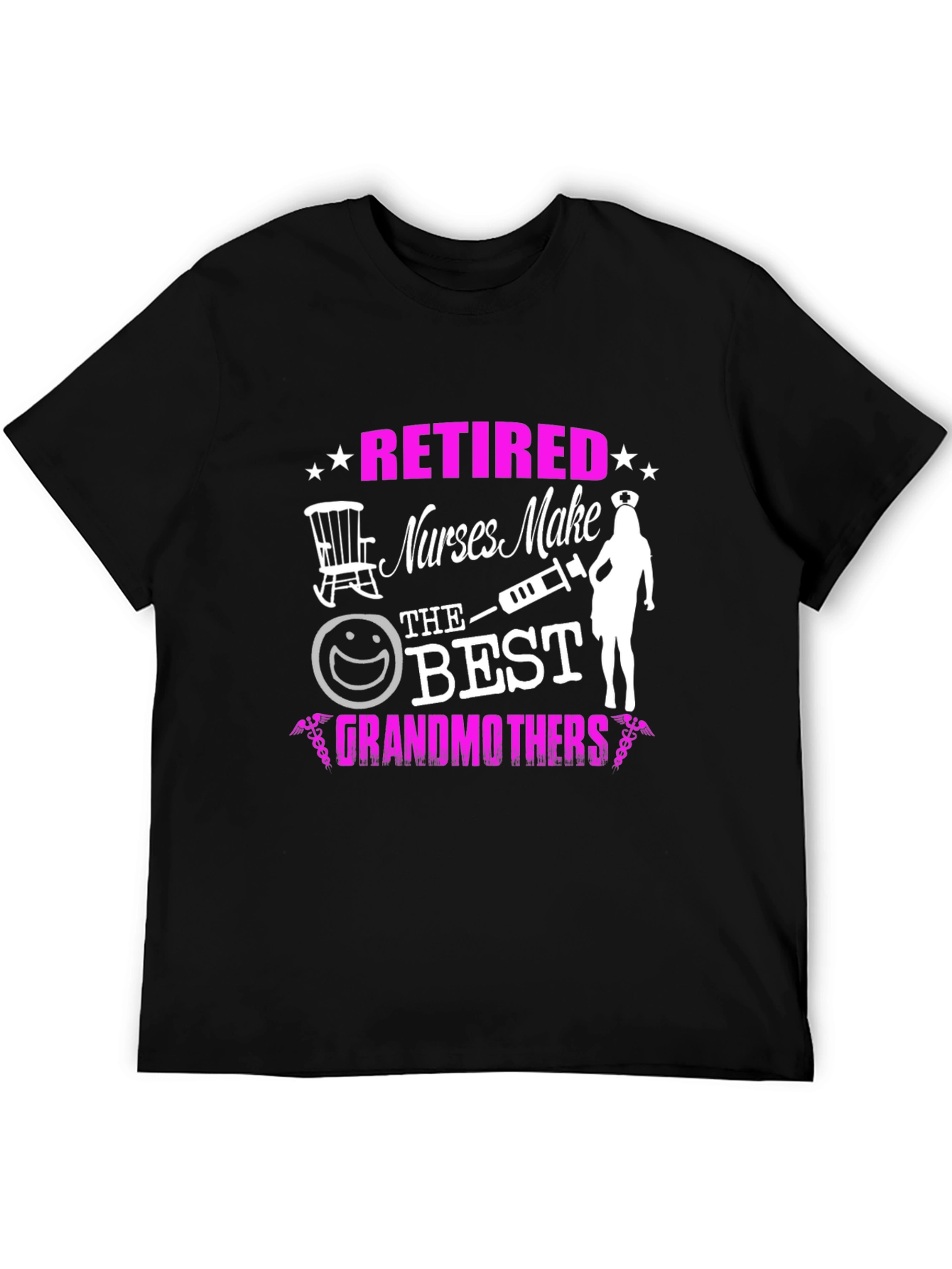 Luce esta llamativa camiseta negra con un divertido diseño. Presenta la frase "Retired Nurses Make the Best Grandmothers" (Las enfermeras jubiladas son las mejores abuelas) en letras blancas y fucsia. El diseño incluye imágenes como una mecedora, una jeringa, el símbolo médico de caduceo y una enfermera. Ideal para regalar a una abuela enfermera jubilada que quieras mucho. Perfecta para usar en un ambiente casual, reuniones familiares o simplemente para expresar tu orgullo de ser abuela. ¡Muestra tu estilo con esta camiseta única!