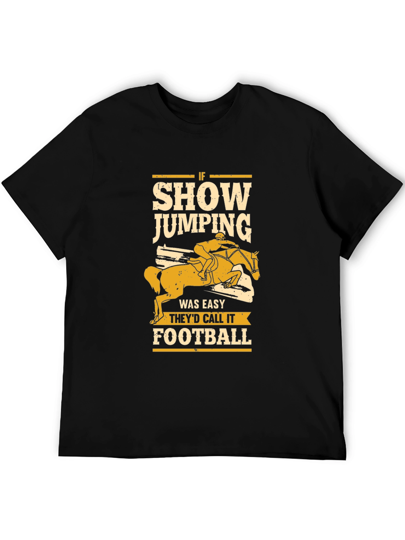 Muestra tu pasión por la equitación con esta camiseta negra de diseño único. La camiseta presenta un llamativo gráfico en color arena que representa a un jinete saltando un obstáculo. El diseño incluye la frase "IF SHOW JUMPING WAS EASY THEY'D CALL IT FOOTBALL", perfecta para los amantes de este deporte. Fabricada con un material suave y cómodo, esta camiseta es ideal para el uso diario, ya sea en el establo, en competiciones o simplemente para mostrar tu estilo ecuestre. Un regalo perfecto para jinetes, amantes de los caballos y aficionados al salto de obstáculos.